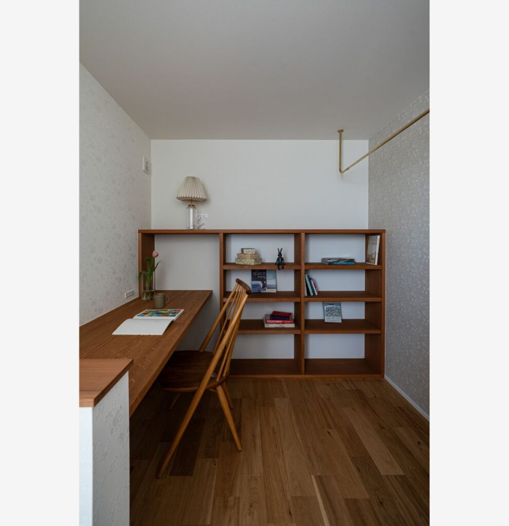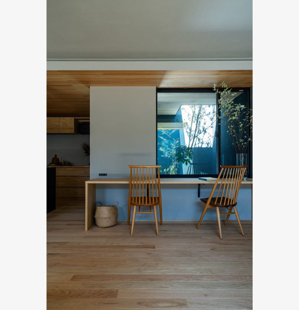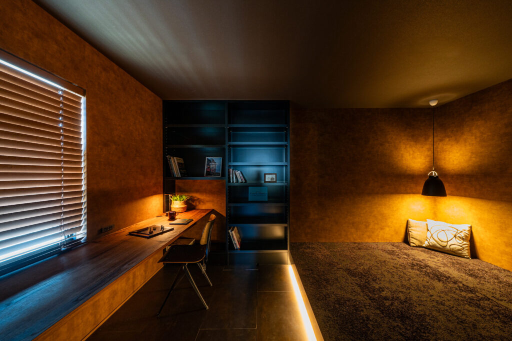 住まいの中心となるのは、キッチンからゆったりと眺められる中庭です。季節ごとの設えや、夜の景色を彩る柔らかな光を愉しめる設計となっており、日々の暮らしに瑞々しい「彩」を添えてくれます。リビングやダイニングの随所にも、お気に入りの品々を飾るための場所を整えました。