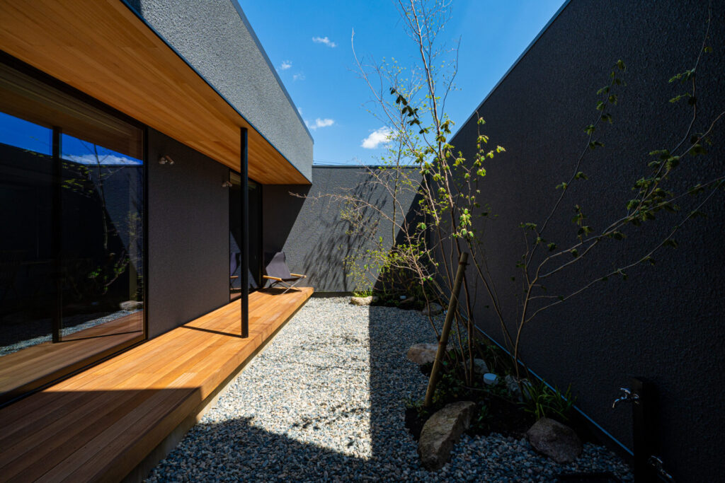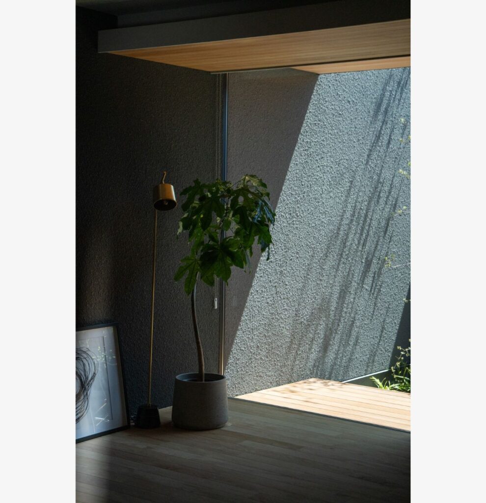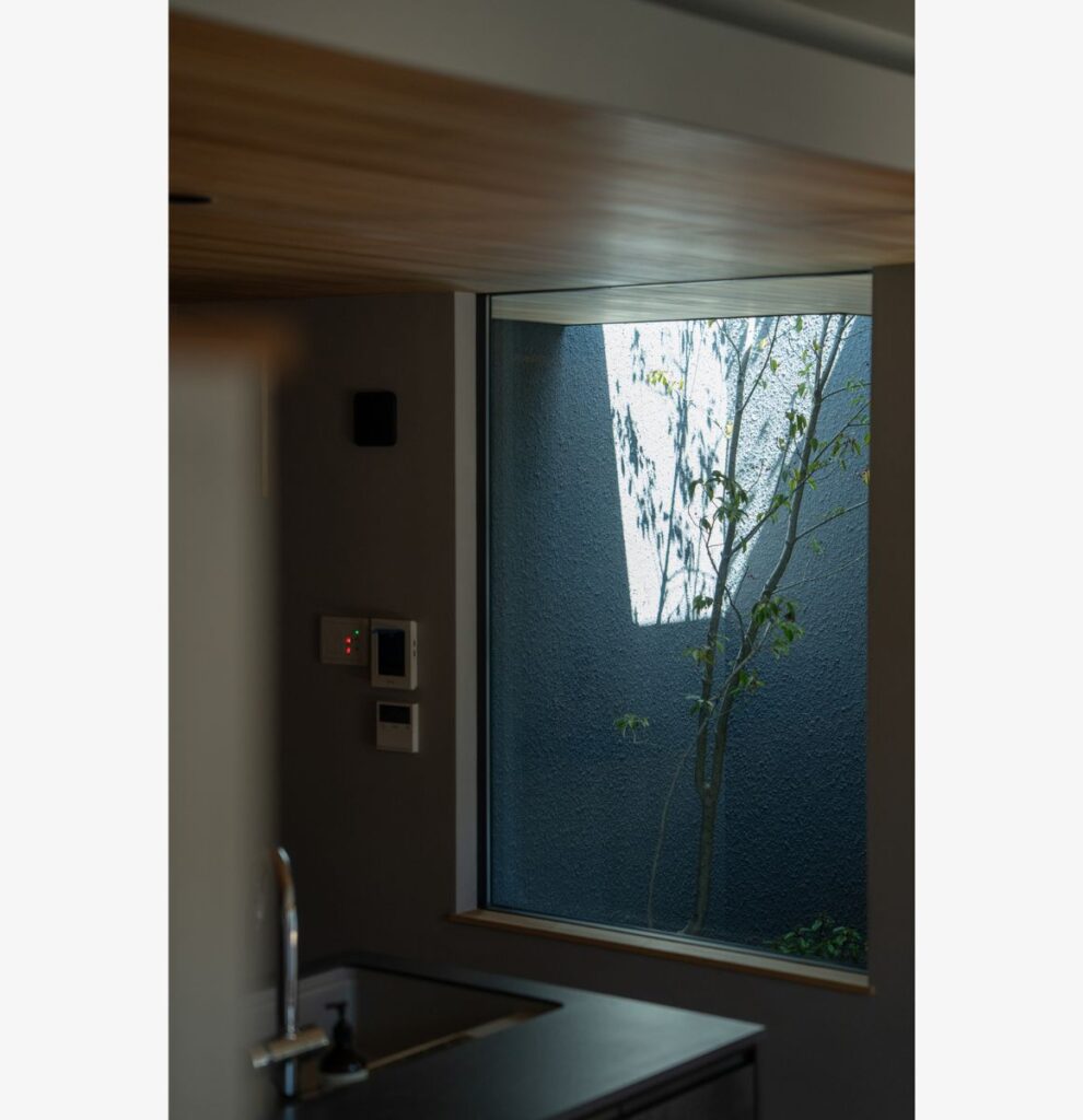 交通量が多く、信号待ちの方からの視線も届きやすい立地条件に対し、私たちは外からの視線を丁寧に遮りつつ、光を招き入れる庭の在り方を計画しました。