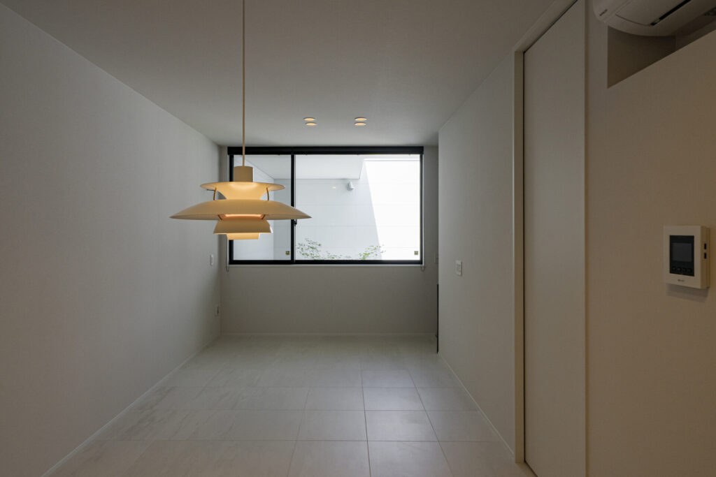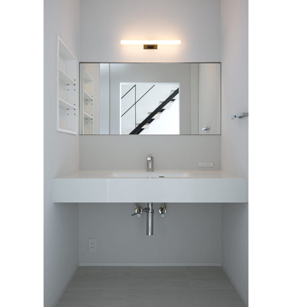 1階は洗面/脱衣/バスなどの水まわりと中庭を、2階はLDKと寝室を配置した間取りとなっています。